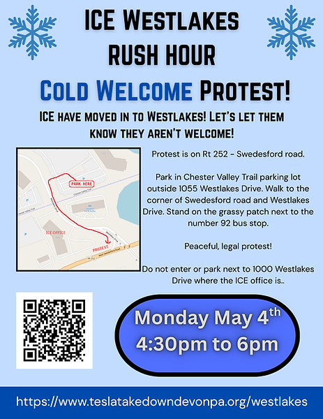 Peaceful protest only! If ICE starts hassling us we will leave. We want to keep everything very safe since they have been known to be "volatile" to protesters. Be sure to keep out of the road and only stand on the grass verge for your own safety and so that the Tredyffrin police don't get worried about traffic accidents!